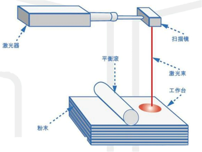 使用高功率激光束將一層金屬粉末加工熔合成型,完成熔合后,操作平臺下調一個層厚的距離,繼續加工下一層粉末,重復此步驟,直至劃定(選定的需要加工)的區域全部熔鑄完成,就得到一件立體的化合物。所需的產品(零件)就是這樣通逐層加工累積而成。