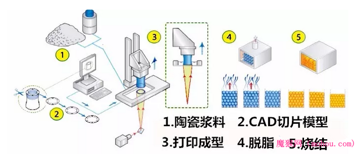 陶瓷件的3D打印包括配置陶瓷漿料、繪制三維模型并分層、3D打印成型、燒結(jié)等流程,其無(wú)需原胚和模具,就能直接根據(jù)計(jì)算機(jī)圖形數(shù)據(jù),通過(guò)增加材料的方法生成任何形狀的物體,簡(jiǎn)化產(chǎn)品的制造程序,縮短產(chǎn)生的研制周期,提高效率并降低成本。