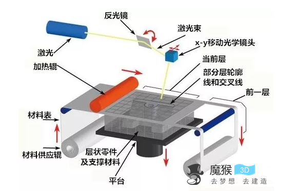 SLA具有成型精度極高陶瓷件燒結(jié)后致比重高的優(yōu)勢(shì);但存在后續(xù)工藝麻煩,以及二次固化問(wèn)題,另外,SLA難以加工折射率較高的陶瓷材料。 7疊層實(shí)體制造(LOM) 在層片疊加制造工藝中,將單面涂有熱溶膠的箔材通過(guò)熱輥加熱,由紙、陶瓷箔、金屬箔等構(gòu)成的材料就會(huì)粘接在一起。然后上方的激光器按照CAD模型分層數(shù)據(jù),用激光束將箔材切割成所制部件的內(nèi)外輪廓,再鋪上新的一層箔材,重復(fù)上述過(guò)程,直至整個(gè)零部件打印完成。
