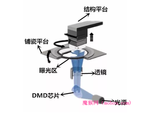 SLS/SLM工藝使用的一般是塑料、蠟、陶瓷、金屬或其復(fù)合物的粉末,其具有無(wú)需支撐即可制備復(fù)雜陶瓷部件的優(yōu)點(diǎn),但也存在因受到粘接劑鋪設(shè)比重的限制導(dǎo)致陶瓷制品致比重不高的問(wèn)題。 6光固化快速成型技術(shù)(SLA) SLA技術(shù)是通過(guò)激光的掃描曝光實(shí)現(xiàn)單層的固化。通過(guò)紫外激光束,按照設(shè)計(jì)好的原件層截面,聚焦到工作槽中的陶瓷光敏樹(shù)脂混合液體,逐點(diǎn)固化,由點(diǎn)及線,由線到面。通過(guò)xy方向固化成面后,通過(guò)升降臺(tái)在z軸方向的移動(dòng),層層疊加完成三維打印陶瓷部件。