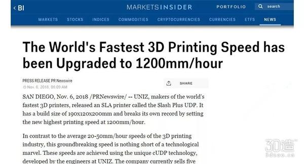 據多家外媒報道,美國東部時間2018年11月6日,早上 8:09 ,全球最快3D打印速度再次被UNIZ科技改寫!UNIZ科技的桌面級3D打印機在cUDP(連續單向剝離)超高速模式下,實現了1200mm/Hour驚人打印速度。而同行業的其他3D打印機平均打印速度在20-50mm/hour。