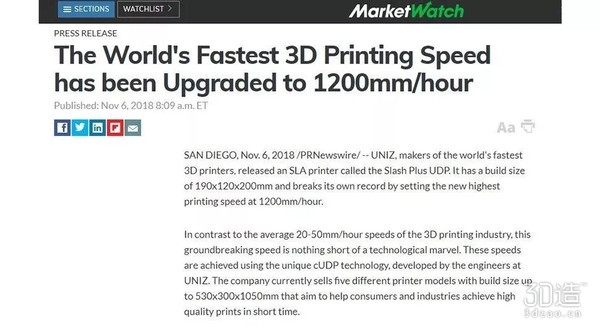 而就在改寫這次記錄之前,UNIZ科技研發的3D打印機已經是行業內打印速度最快的產品,NP(自然分離)模式可達到200mm/Hour,cUDP超高速模式下可達到600mm/Hour的速度。本次的技術突破更是把速度提升了一倍,打破了自己保持的最快紀錄。